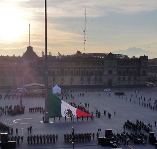 Note how in the photo above the army comes shortly after dawn to raise the flag as it does each day, only today on October 2nd on this official day of mourning it will only be to half-mast. Yet they do it with special pomp and circumstance, press corps, public officials, a brass band, as if to erase the institution's culpability in the Massacre. At noon to your left a map of Mexico drawn in chalk is filled with shoes and other articles of clothing as were left behind in Tlatelolco. ¡El 2 de octubre no se olvida!