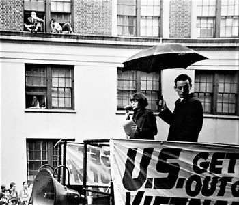 Now regional organizer for New York SDS, Xerar Murphy addresses the audience as Dan Millstone holds an umbrella. Although years before the Pentagon Papers were published, she knew all their essential information, the ironies of that moment still escape her.