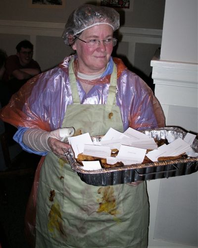 If there will be servers wandering around among the public as at an art opening, they should dress to resemble workers in poultry plants, and if possible wear splints or bandages to mimic typical injuries. They should remain silent even if questioned by the public but if it seems appropriate give out cards.